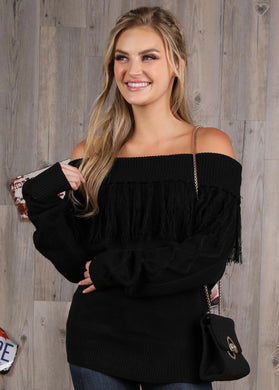 Black Off Shoulder Fringe Sweater Top