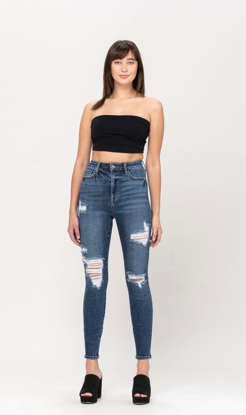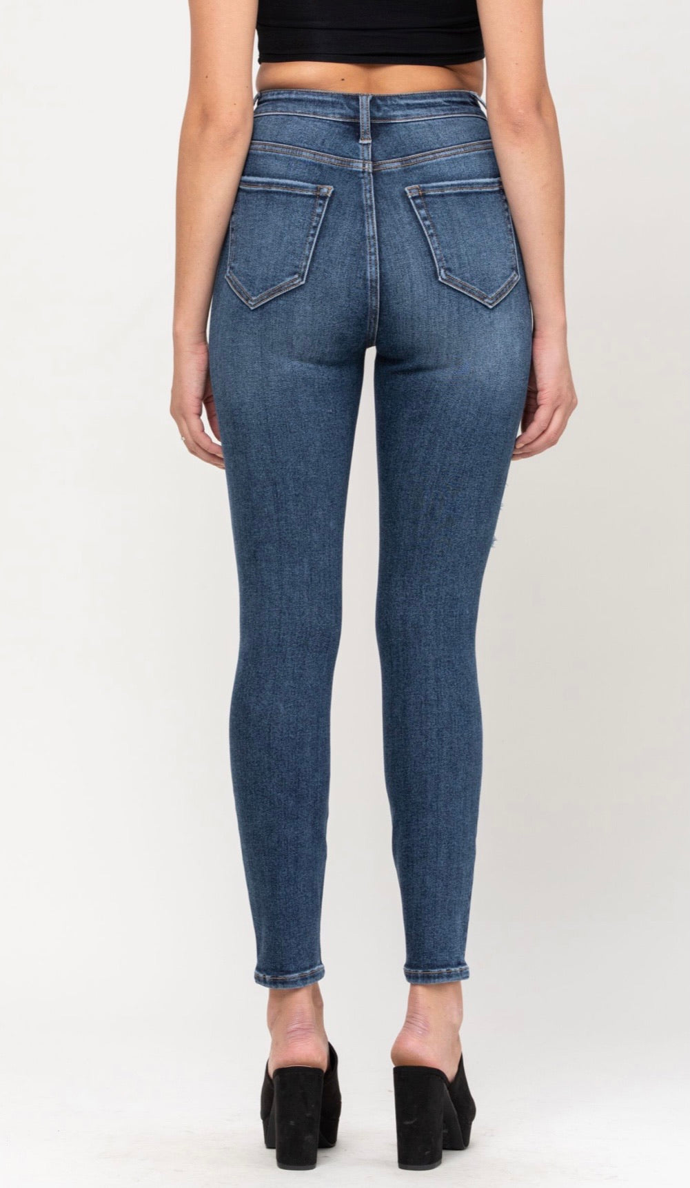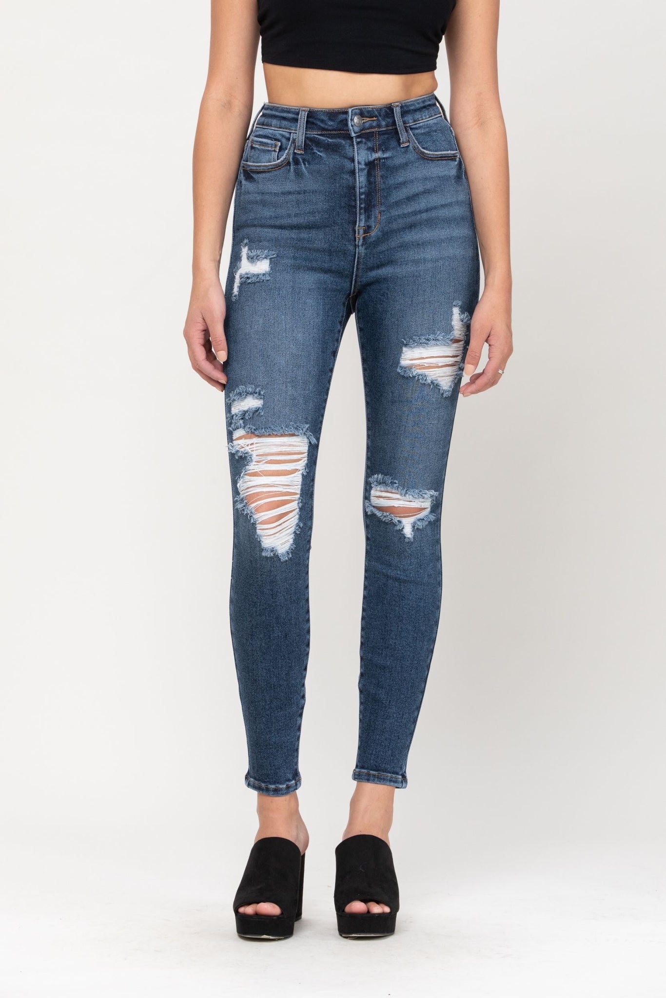 Cello High Rise Distress Ankle Skinny- Dark Wash