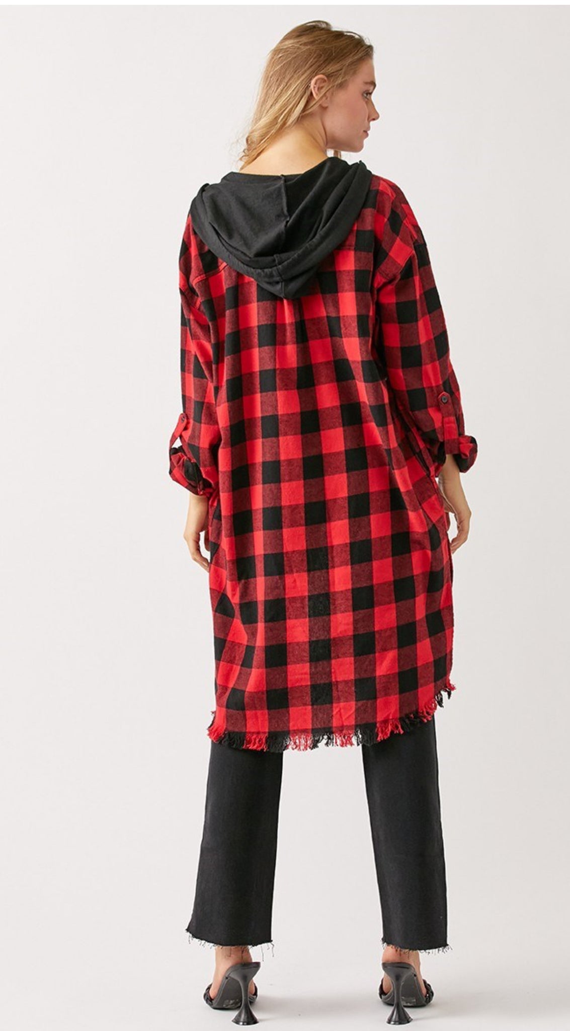 FLANNEL SHIRT JACKET WITH HOODIE- Length 38.5" | 1/2 Chest(1" below armhole) 22.5" in size S- Model Info: Height 5'8 | Waist 23" | Hips 34"