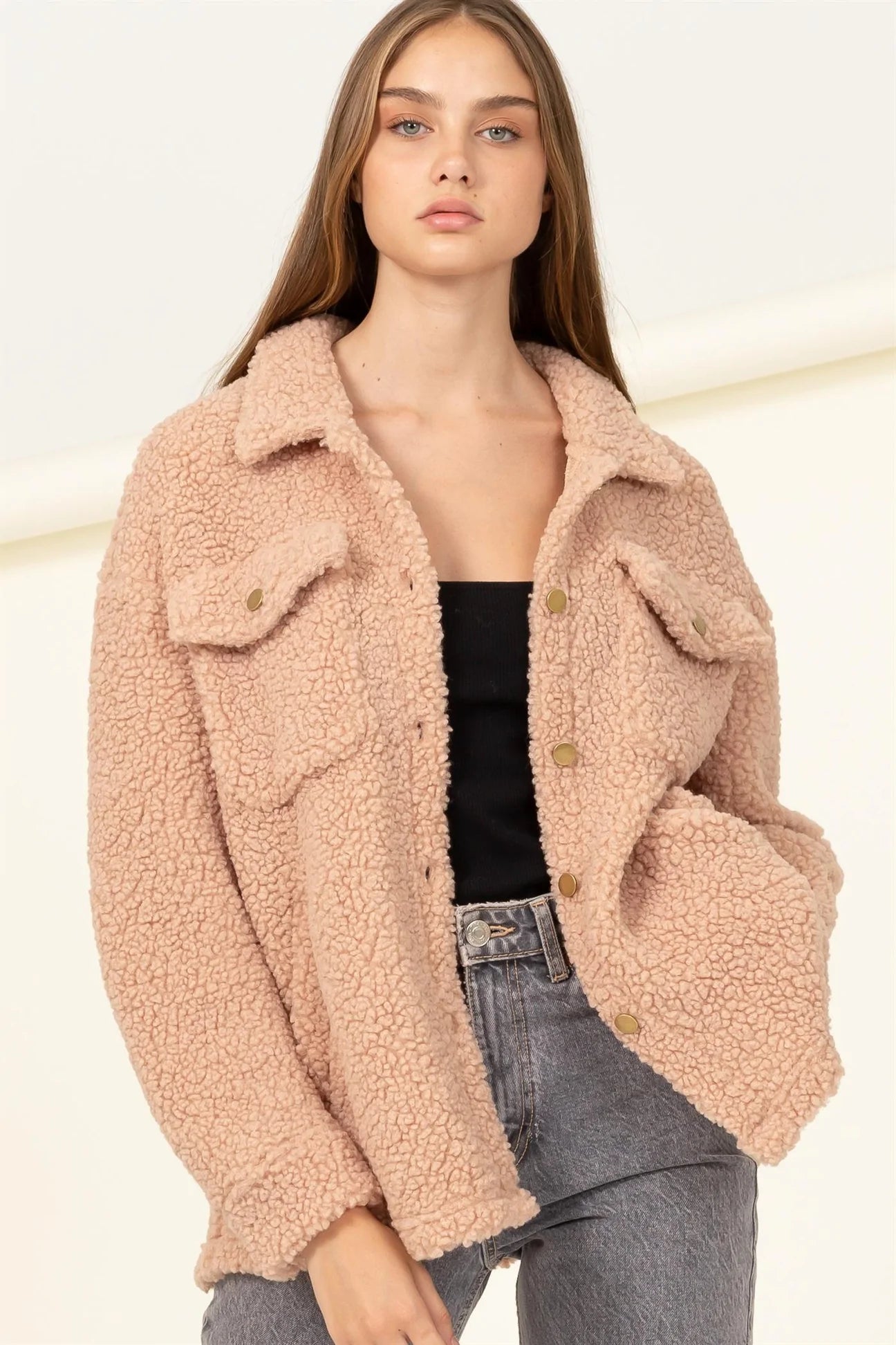 CHILLY DAYS ARE ALL ABOUT ELEVATING YOUR EVERYDAY STYLE! WARM AND SNUGGLY, THIS JACKET HAS BEEN CUT WITH A SPREAD COLLAR, LONG SLEEVES WITH CINCHED CUFFS AND FRONT FLAP POCKETS FOR ADDED STYLE. BUTTON-FRONT BODICE MAKES SURE TO STAY COMFORTABLE.100% POLYESTER